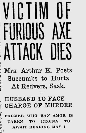 As my hunt for the haunted skull of the Kerrobert Courthouse continues, there are certain keywords that are certain to grab my attention as I scroll through the piles of 1930s news articles. Axe murder is definitely one that makes me sit up in my chair. And in the spring of 1934, just over a month apart, there were two.