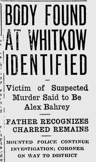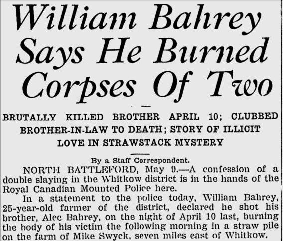 The body was burned beyond recognition but RCMP believed the remains belonged to Nestor Terecszuk, a man who’d been missing since the previous October. He’d been married to a woman named Annie Bahrey, but she’d separated from him after it came to light that he already had a wife, alive and well, back in Poland. The Bahrey family was furious with Nestor for this indignity to Annie, and coincidentally, on the same day of the fire, Annie’s brother Alec (sometimes referred to as Alex in the articles) had told their brother William (also called Bill) that he was going to hunt muskrats and had taken his horse and left. It seemed likely that Alec had killed Nestor and fled the law.