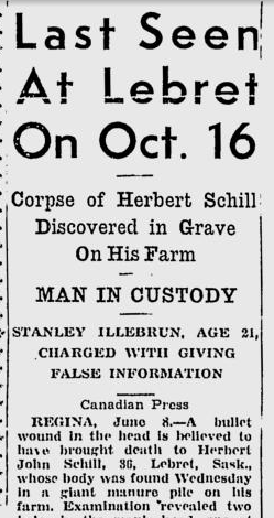 It was a routine Sunday for Herbert Schill on October 16, 1938 in Lebret, Saskatchewan. First church, then lunch with a friend before returning home to his farm where his wife and family waited. In the evening, he changed out of his church clothes and went out to the barn with their farmhand, Stanley Illerbrun, to milk the cows.