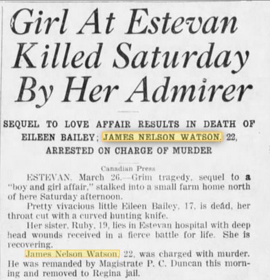 Eileen and James had been friends for about two years. He had worked at the Bailey farm the previous fall under the government’s special farm employment plan and the two had also been in a play together. James was twenty two. His father, Harry Watson, upon hearing about the murder was stunned. He knew his son was in love with Eileen, but never thought he’d react with such violence to Eileen’s rejection.