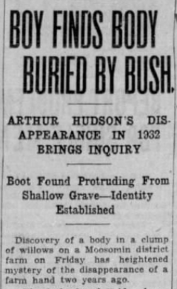 Hudson had left the home of Thomas Fry, his employer, on horseback on April 11, 1932. When the horse returned riderless later that evening, a search was mounted but Hudson was never found. Now, two years later, his body had been discovered on the Roe farm just a short distance from the Fry property.