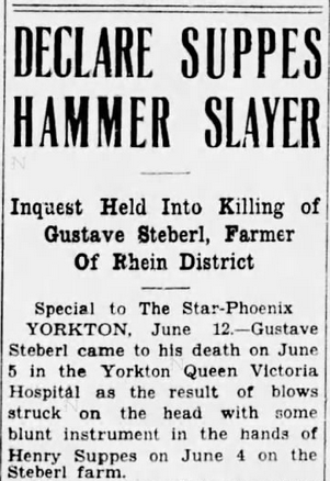 The preliminary hearing was held on June 13, 1933, before magistrate W. B. Scott of Regina. Rosie Steberl was the first to testify. Henry Suppes also testified on his own behalf. He’d only been working for the Steberls since May 12, 1933, not even a full month. He told the court that on June 4th he’d been to Rhein with the Steberls and when they returned he’d unhitched the horses. After putting them in the barn he suddenly became tired of farm work and decided to quit, so he left and walked to his home at Rhein. He denied striking his employer with the hammer and told the court he hadn’t even held a hammer that day. He was committed to stand trial at the next court of the king’s bench, to be held in Regina.