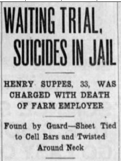 But he never stood trial. In the early morning of Tuesday, July 25, 1933, Henry Suppes was found dead in his cell. He’d ripped his bedsheet in half, wound it into a cord, tied one end around his neck and suspended himself from the grating near his window.