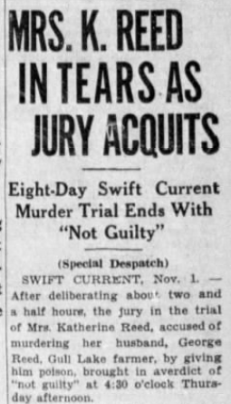 On November 1, 1935, after an eight day trial, the jury found Katherine Reed not guilty of murder. It was possible she could still be charged with abetting a suicide, but the RCMP told journalists that it was unlikely further charges would be laid.