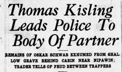 Oskar Schwab, a young man of twenty-eight, had been trapping in the area every winter since the fall of 1928. He’d erected the little log cabin in a small valley near the river, returning each year after working as a farm labourer in the Bruno district during the summers. In November of 1932, he’d returned, bringing a man named Thomas Kisling with him as a trapping partner. Thomas Kisling was a forty-four-year-old farmer, married with six children. The two appeared to be good friends.