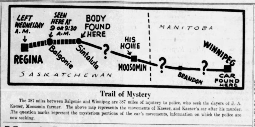 Kaeser was known to carry cash and pick up hitchhikers. It was believed that when he left Regina he had about $200 in cash on his person that was now missing, the equivalent today being between $3500-$3700. The RCMP believed Kaeser had most likely picked up a hitchhiker and been robbed. They started canvasing every filling station between Balgonie and Winnipeg, while police in Winnipeg continued their own investigation.