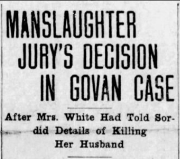 John Goldspinks denied pretty much all of Doris White’s testimony. According to him, he was in bed when he saw Mrs. White carrying a stick of some kind into the bedroom she shared with George. He heard noises that sounded like blows and jumped up in bed. Mrs. White poked her head through the curtains in the door between the two rooms and said, “I have fixed him this time.” He told the court that he could see George’s feet on the floor but didn’t think anything of it, as he would come home drunk all the time and pass out all over the place. He laid down in bed again and went to sleep. Later, Mrs. White shook him awake and told him they’d have to take the body to the stable. He denied doing anything with the bedclothes or having anything to do with it aside from helping to move the body. He denied handing her the shotgun and insinuated it was an axe handle she’d hit him with, not the butt of a gun. He testified that he was pretty sure the shotgun in question was at the White farm, five miles from Govan, although apparently police did find a rifle under his bed.