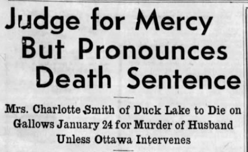 Several doctors were called to testify on the state of Charlotte Smith’s mental health. Dr. MacNeil, a psychiatrist and superintendent for many years of the Battleford Mental Hospital, told the court he believed Charlotte was subnormal. He described her as a woman so mentally deficient that she had the intelligence of an eight-year-old and was unable to appreciate the charge of murder facing her.