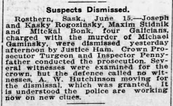Finally, on May 15, 1907, Joseph Rogozinsky, his nephew Jasky Rogozinsky, Maxim Stadnik and Michael Bunk were all arrested and charged with the murder of Michael Zaminsky. They were all granted bail at $2000 each and court was adjourned until May 21, 1907 when the preliminary trial began.