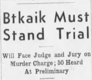 On April 16, 1938, Btkaik was given mental tests to check for insanity. He was found mentally fit and on May 3, 1938, the murder trial opened.