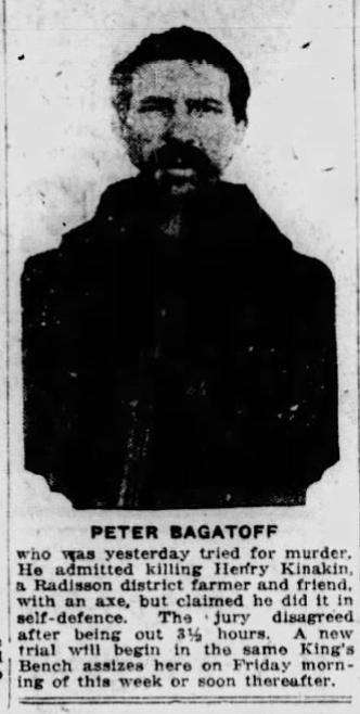 He’d lived in the Radisson district for two years and had met Henry at the last harvest, when he started working for his father, George Kinakin. By all accounts, they seemed to get along fine. On the day of the murder, he told the court that after helping Henry put the box on the sleigh, Henry had gone to the granary and returned with a gun, which he leaned against the sleigh. He asked Henry where he was going and he said to shoot some coyotes. Henry then asked him to watch the horses while he went inside to get a couple of shells. He returned a few minutes later and started putting shells in the gun, with the gun pointed at Bagatoff. According to Bagatoff, Henry had the gun pointed at him and told him, “you a no good Doukhobor.” He became frightened and seized the axe, slashing at Henry’s hand and knocking the gun to the ground. He said Henry reached down to pick up the gun, so he hit him on the head with the axe. He claimed to already be in the sleigh when Perana came out of the house, and didn’t chase her. He also stated that Henry was standing when he left.