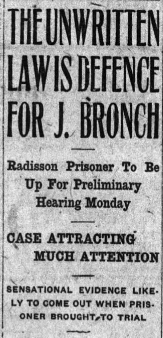 John Bronch’s trial opened on November 17, 1919 in North Battleford. He was represented by T. A. Lynd of Saskatoon.