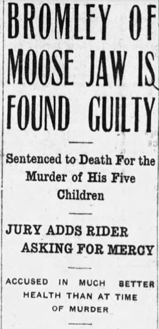 Walter Bromley took the stand and stated that mental illness ran in his family, pointing to an uncle born with an intellectual disability. On cross examination by acting Crown Prosecutor Rose of Weyburn, Bromley admitted that he’d murdered his children, declaring that he couldn’t give a motive.