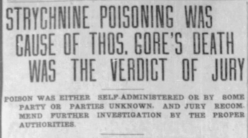 A Coroner’s Inquest began on April 14, 1914, and was presided over by Dr. Mclean. Dr. McCutcheon performed the autopsy and the internal organs were examined and tested by Dr. Charlton, the provincial analyst. When the inquest closed on April 16th, the jury was clear in their verdict. Thomas Gore died of strychnine poisoning.