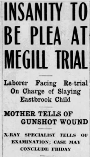 The defense, surprisingly, didn’t deny that Megill had done it. Instead, they claimed that Megill was not mentally responsible, because of a head injury he’d received at 13. His mother travelled from Markham, Ontario, to testify to this, telling the court that he’d been wounded in the head by a gunshot. A bullet had grazed his brain on the right side, and he’d been unconscious for some time. There was only one bullet hole, so it was believed pieces were still inside his head. She told the court that he’d been normal before the injury, but afterwards had complained of severe headaches and acted queerly at times, nervous, and with a vacant stare in his eyes. The defense said this injury was further exacerbated by a fight Megill had gotten into with a man named Earl Mason, during which he’d received several blows to the head, just four days before the murder.